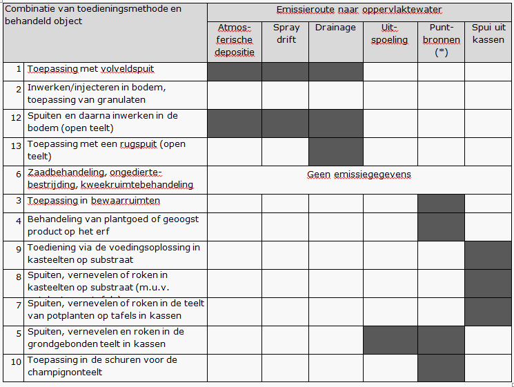 Tabel 1: Emissieroutes naar oppervlaktewater per combinatie van toedieningsmethode en behandeld object; op percelen, open teelt (1, 2, 12, 13), op het erf (6, 3, 4), en in de bedekte teelt (9, 8, 7, 5, 10)