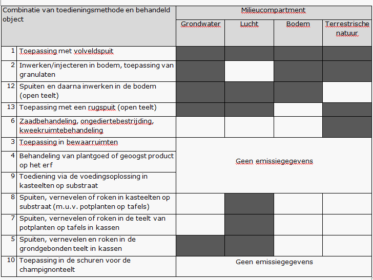 Tabel 2 toont de koppeling tussen de modules voor verschillende soorten toepassingen (combinaties van behandeld object en toepassingsmethode) en de milieucompartimenten grondwater, lucht, bodem en terrestrische natuur.