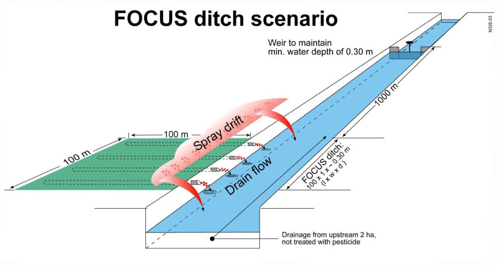 TOXSWA v1.2, simulates constant water depths and discharges. In FOCUS_TOXSWA water (and pesticide) fluxes from drainage or surface runoff from a small upstream catchment basin and an adjacent field can run into a ditch or small stream. FOCUS_TOXSWA is able to simulate the resulting transient flow regime with rapidly varying discharges and water levels in the ditch or small stream. FOCUS_TOXSWA is coupled to the MACRO and PRZM models to simulate exposure concentrations in the FOCUS Surface Water Scenarios, used in the EU registration procedure.