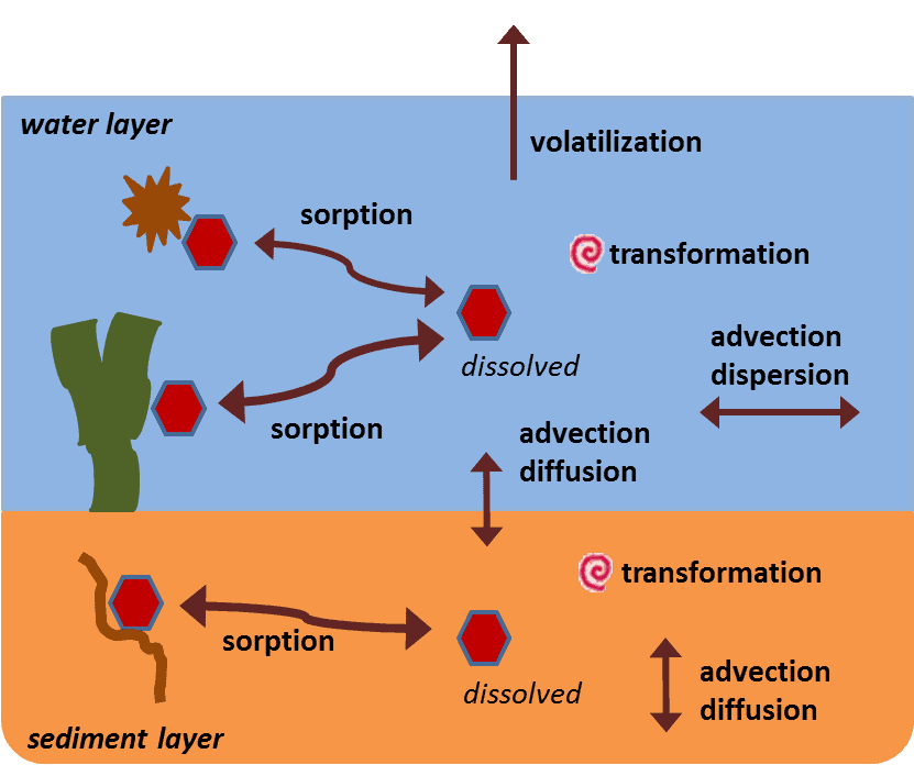 In the water layer, pesticides are transported by advection and dispersion. In the sediment, diffusion is included as well. Transformation depends on temperature. The transformation rate covers the combined effects of hydrolysis, photolysis and biodegradation. Sorption to suspended solids and to sediment is described using the non-linear Freundlich equation. Sorption to macrophytes is described using a linear isotherm. Pesticides are transported across the water-sediment interface by upward or downward seepage and by diffusion.